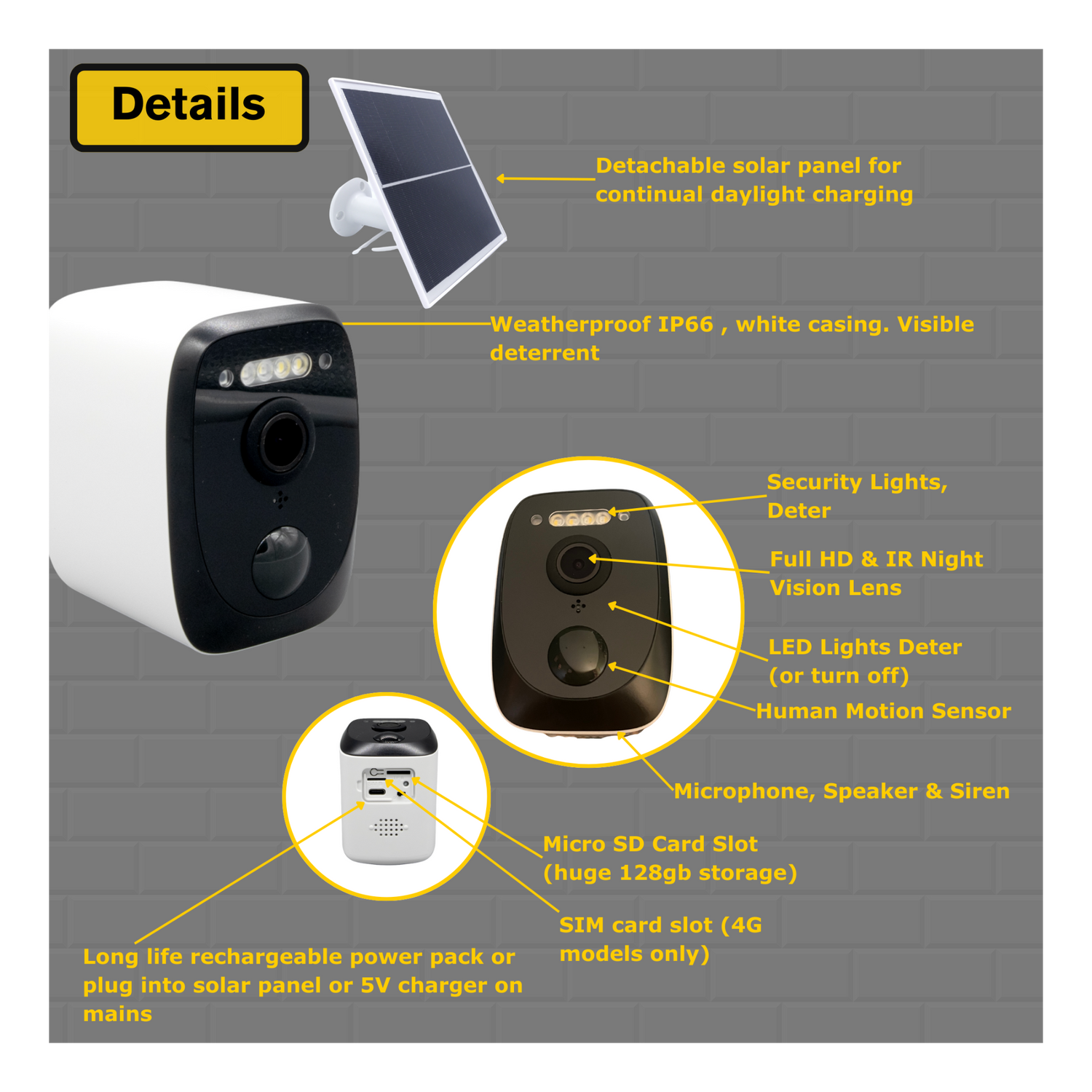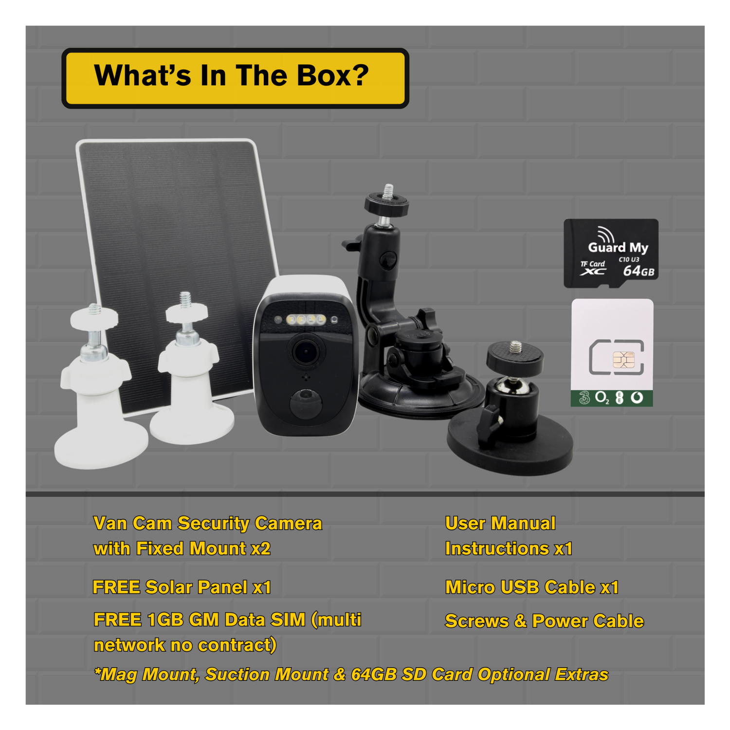 All packages include indoor/outdoor full HD, night vision solar powered camera, solar panel and multi-network no contract SIM card with 1GB preloaded.