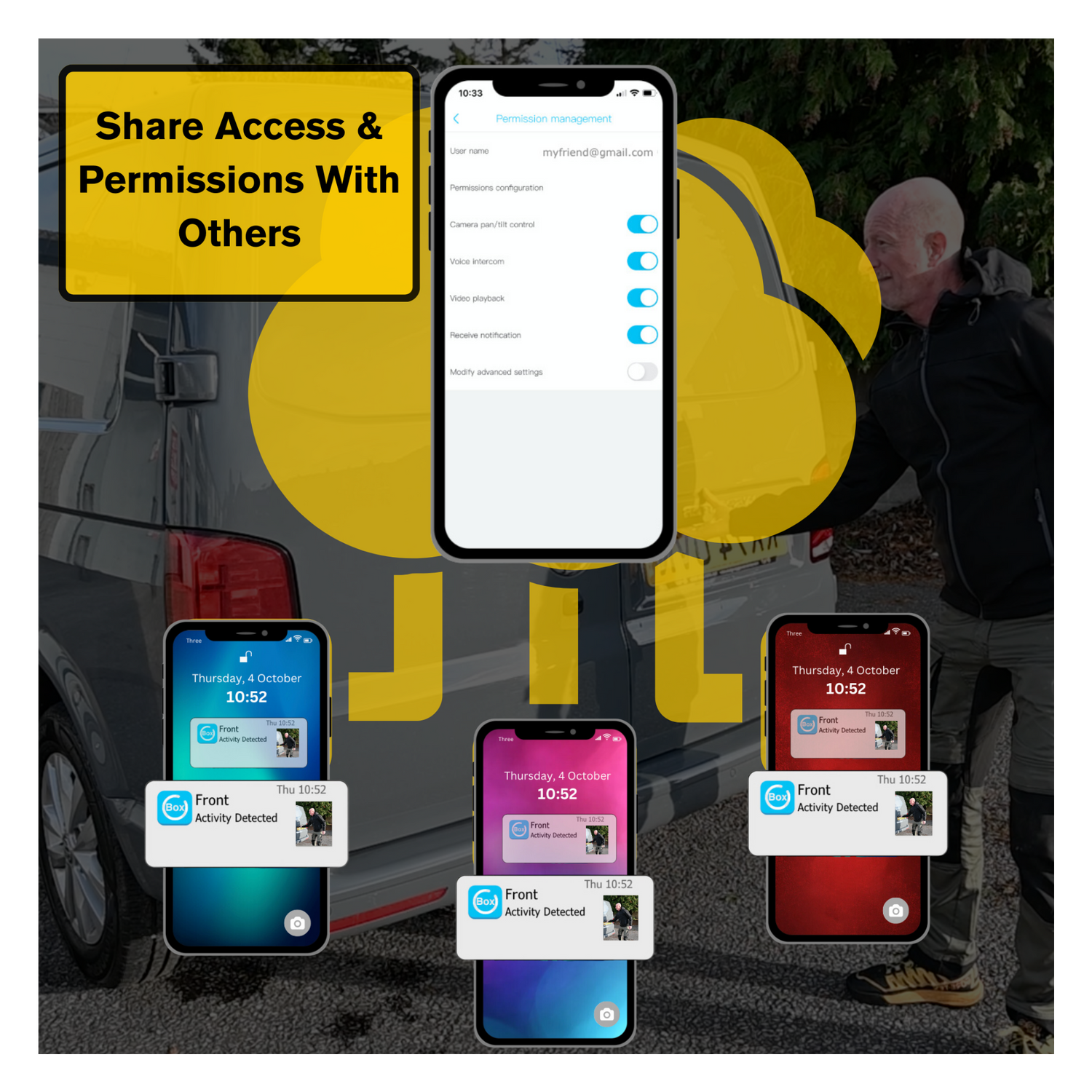 Simply invite others to access your cameras. You control the permissions and remove them at any time.